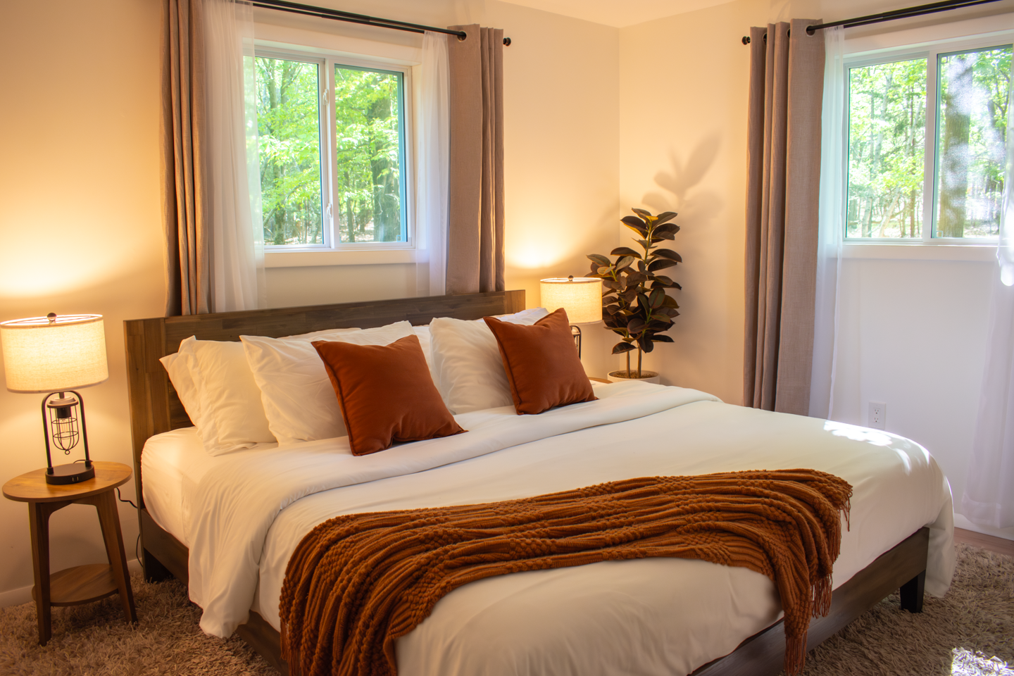 A King-size bed with tons of storage, blackout curtains, and USB port charging lamps.