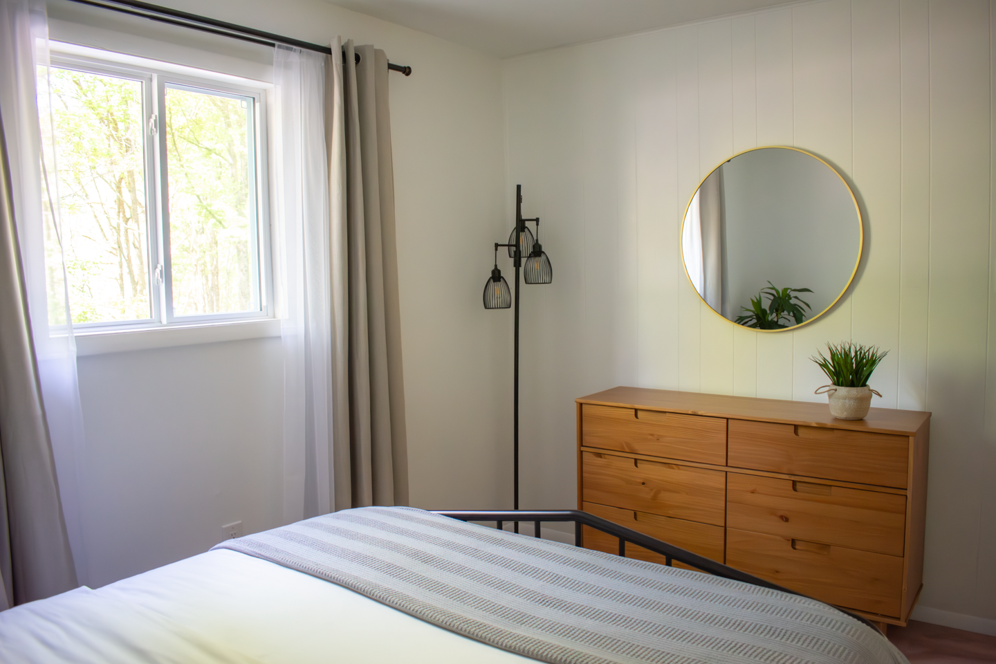 Featuring a cozy Queen-size bed, closet, dresser, and darkening curtains.