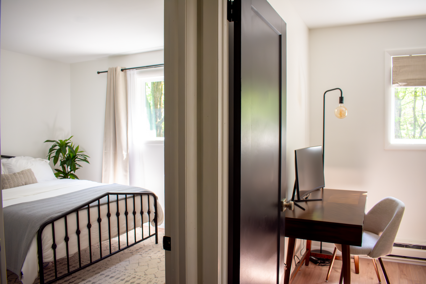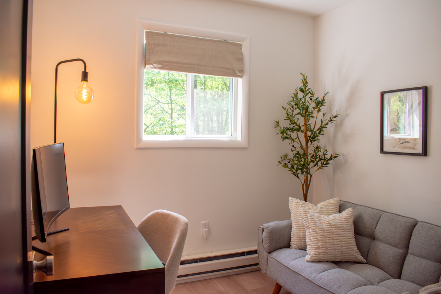 Sofa bed and dedicated workstation, including high-speed internet, desk, and monitor with HDMI cable.